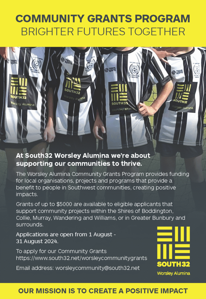 South32 Worsley Alumina Community Grants Program provides funding for local orgnaisations, projects and programs that provide a benefit to people within the Shires of Boddington, Collie, Murray, Wandering and Williams, or in Greater Bunbury and surrounds.